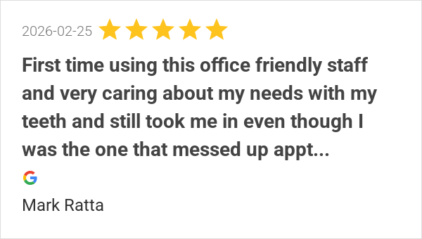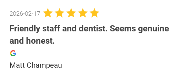 Friendly staff and dentist. Seems genuine and honest.