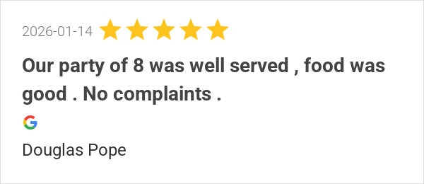 Our party of 8 was well served , food was good . No complain...