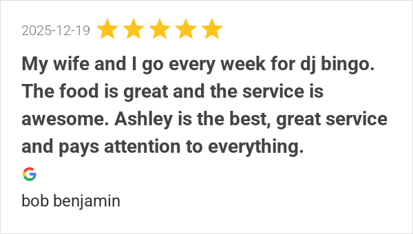 My wife and I go every week for dj bingo. The food is great ...