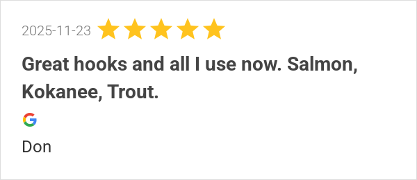 Great hooks and all I use now. Salmon, Kokanee, Trout.