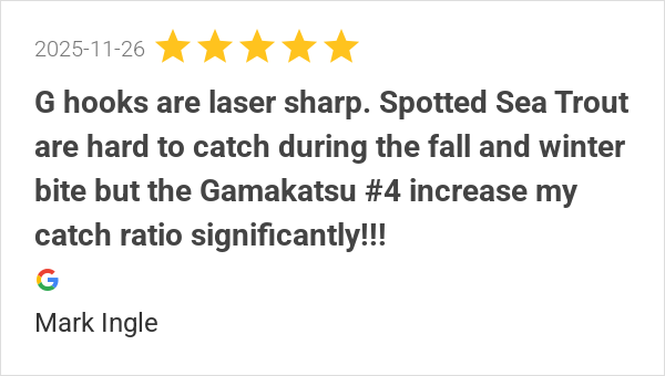 G hooks are laser sharp. Spotted Sea Trout are hard to catch...