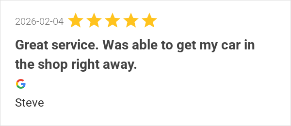 Great service. Was able to get my car in the shop right away...