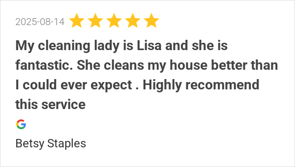 My cleaning lady is Lisa and she is fantastic. She cleans my...